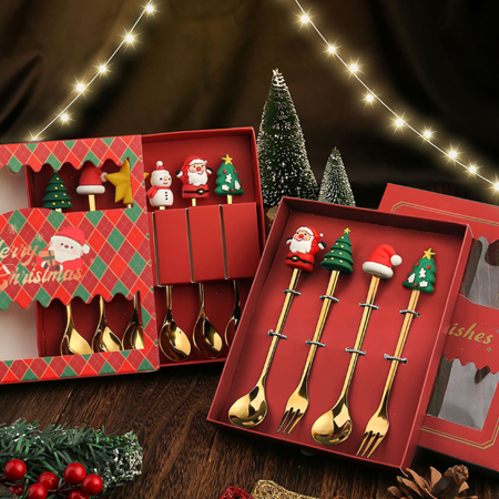 這款聖誕童話金色叉匙組,以雪人、聖誕樹、聖誕老人等經典節日元素設計,搭配質感金色柄身,為餐桌增添滿滿歡樂與儀式感。採用高品質不鏽鋼材質,耐用不易生鏽,圓潤邊角設計,使用安全安心,適合攪拌咖啡、甜點、蛋糕與各式飲品。無論是聖誕派對、交換禮物、居家佈置或店面迎賓,都非常吸睛實用。精緻又具收藏價值,是冬季必備的節慶小物與送禮首選。