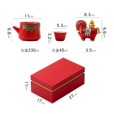 以喜氣大紅為主色,結合吉祥象徵「馬上有福」的創意擺件,傳遞祝福與好運的美好寓意。茶壺與茶杯皆採用高溫燒製陶瓷打造,質地細膩、手感溫潤,搭配原木質感元素,呈現東方雅韻與現代設計的完美融合。230ml 茶壺容量適中,搭配 45ml 小巧茶杯組合,適合品茶、待客或獨享靜謐時光。整組收納於質感紅色禮盒中,內襯泡棉穩固保護,不僅實用,更具收藏與送禮價值。無論是節慶賀禮、開幕祝賀、年節送禮或自用皆十分得體,為生活增添一份溫暖儀式感與滿滿福氣。