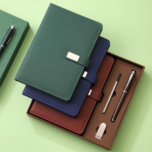 封面採用變色PU皮革材質,手感細緻,外觀簡潔耐看,搭配翻蓋扣帶設計,兼具收納與保護功能,內頁使用加厚紙張,書寫順暢,適合會議記錄、工作筆記或日常書寫。禮盒內附簽字筆,筆身設計簡約,書寫手感穩定,與整體禮盒風格相互呼應。