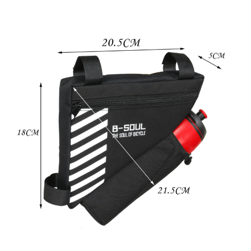 本款自行車三角工具包以實用收納為核心設計,外型依車架三角空間打造,尺寸約 20.5×18×21.5公分,厚實耐用又不影響騎行操作。包身採用高強度面料製作,具備良好耐磨性與抗拉扯表現,可穩固固定於自行車車架上,安裝簡單方便。拉鍊開口設計順手直覺,能有效保護包內物品避免掉落或碰撞。無論日常通勤或戶外長途騎行,都能輕鬆攜帶各類工具配件,讓騎行過程更加安心有序。